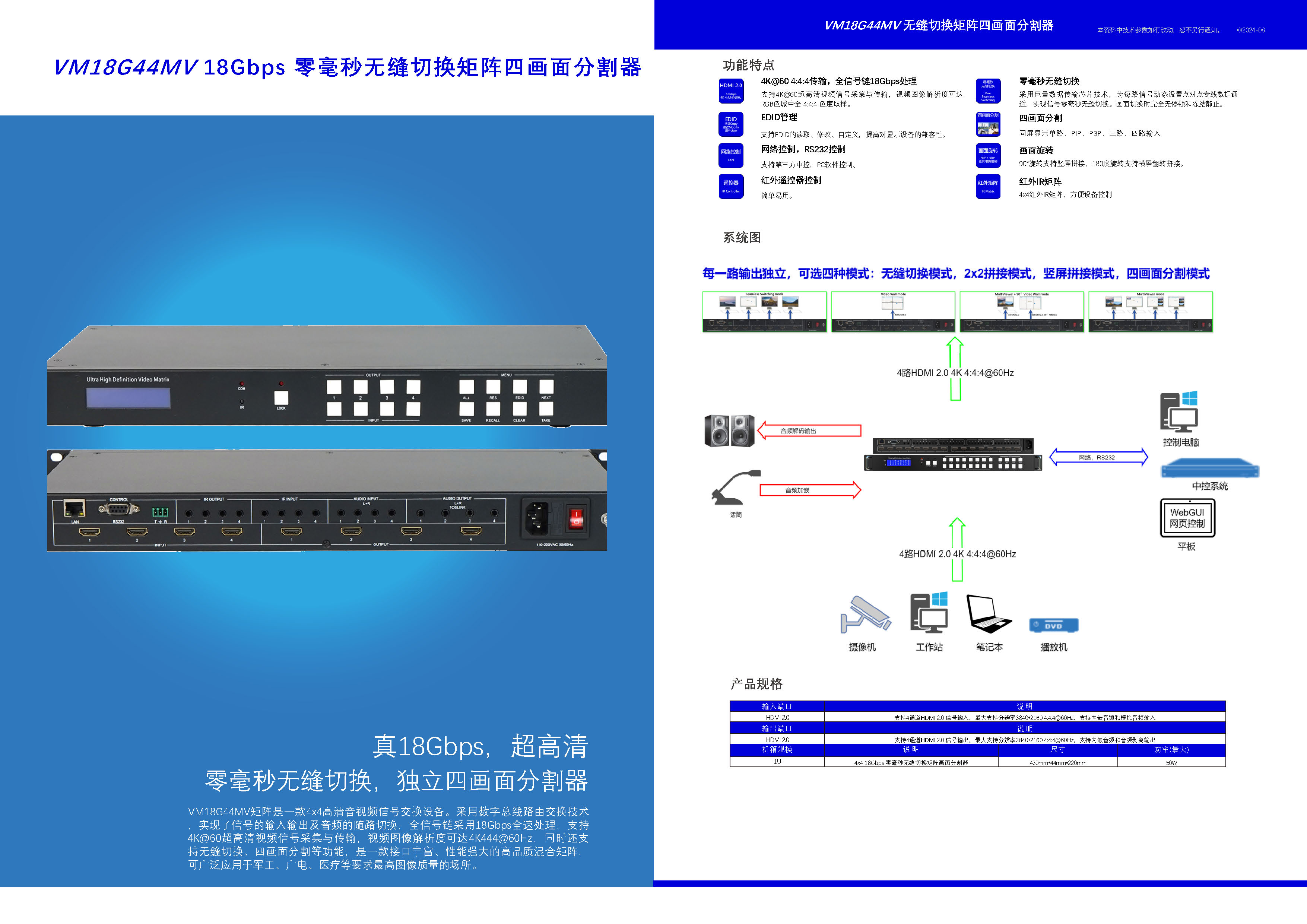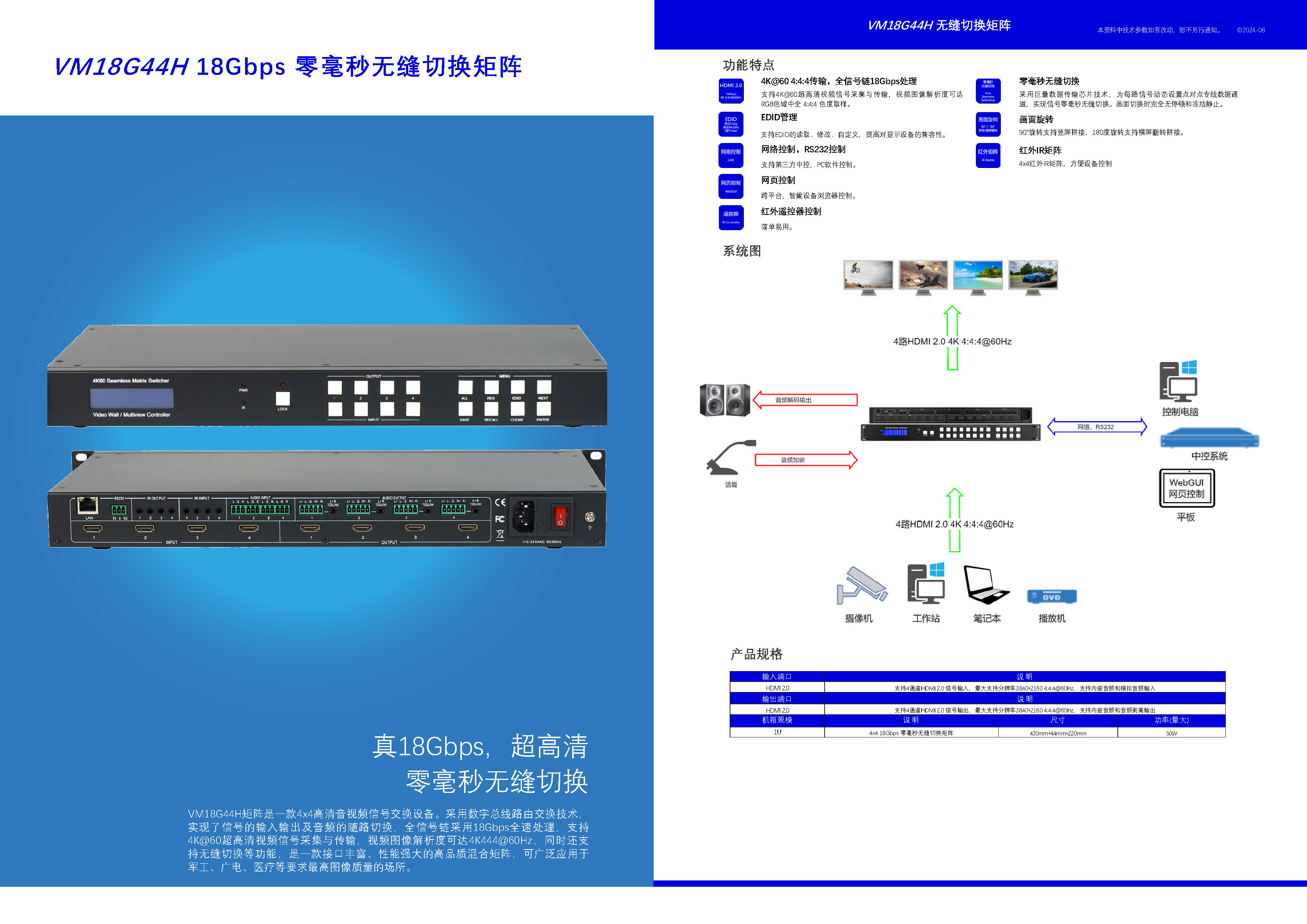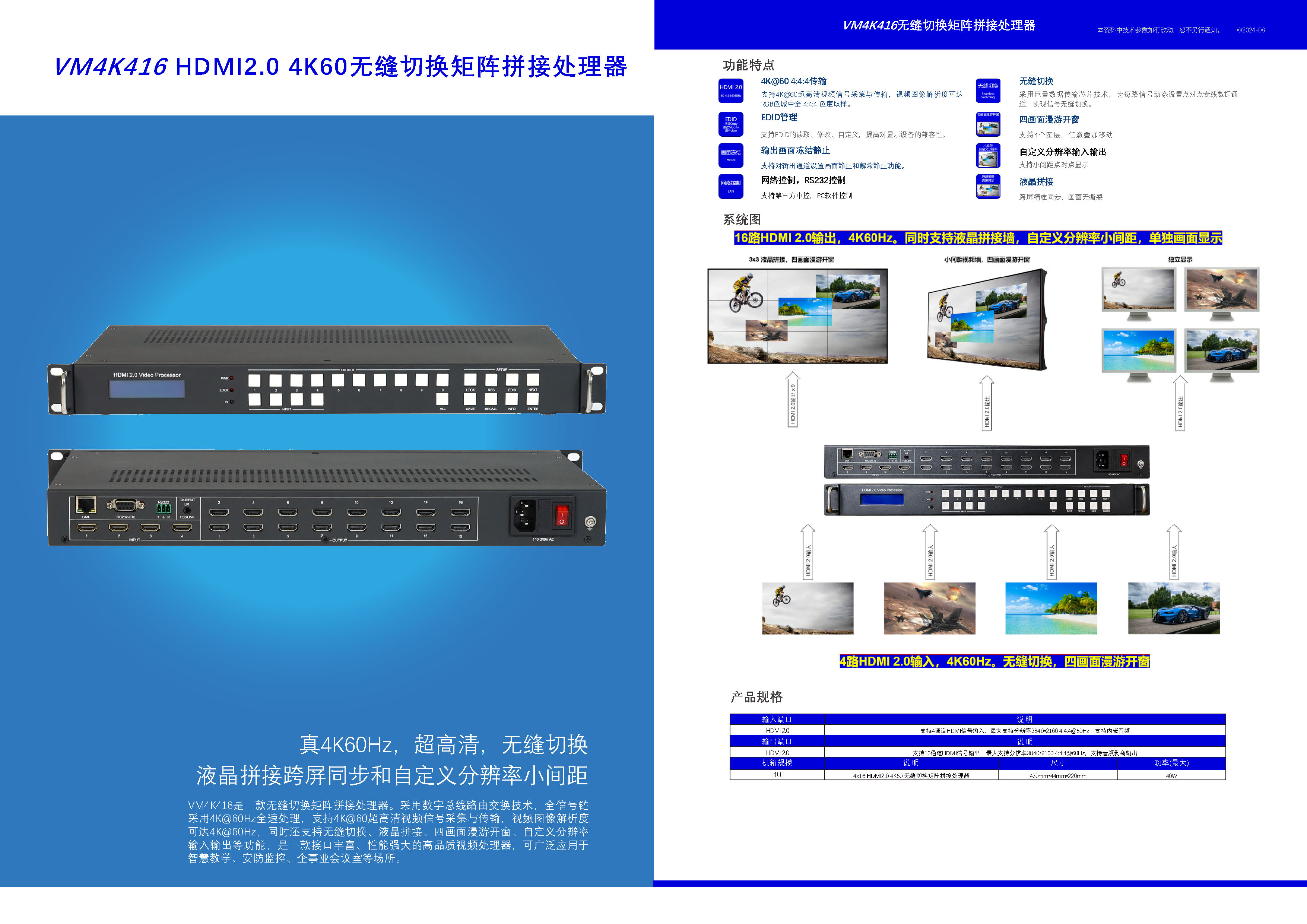 VM4K3044H4:4x4 4K30无缝切换拼接矩阵 1、视觉无损图像处理 2、真4K30Hz,全链路444彩色空间 3、非假4K30Hz:内部1080p处理,文字表格图像模糊 4、液晶拼接