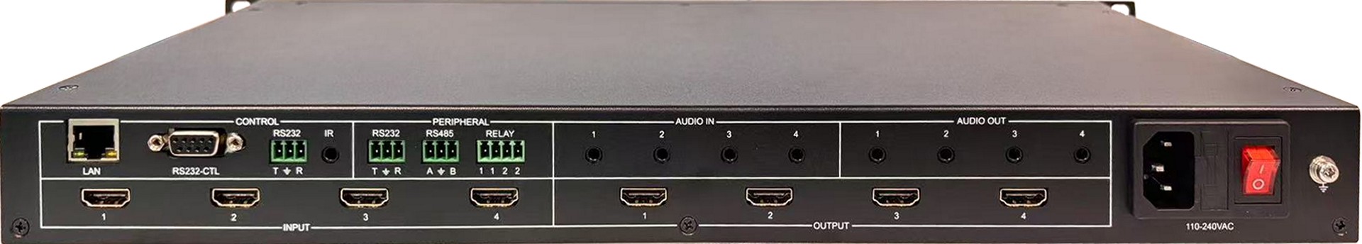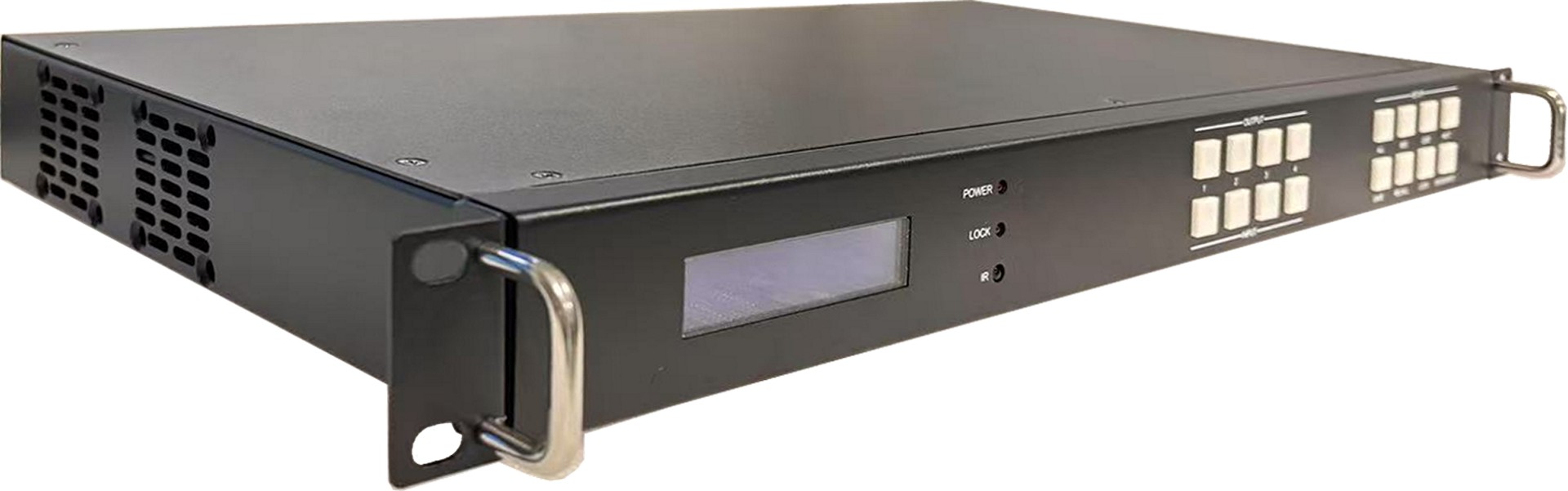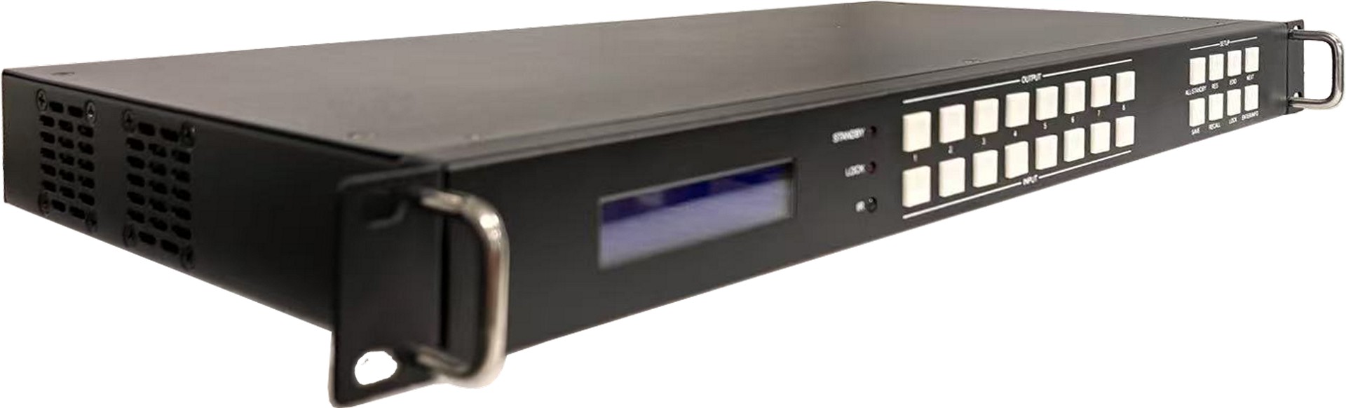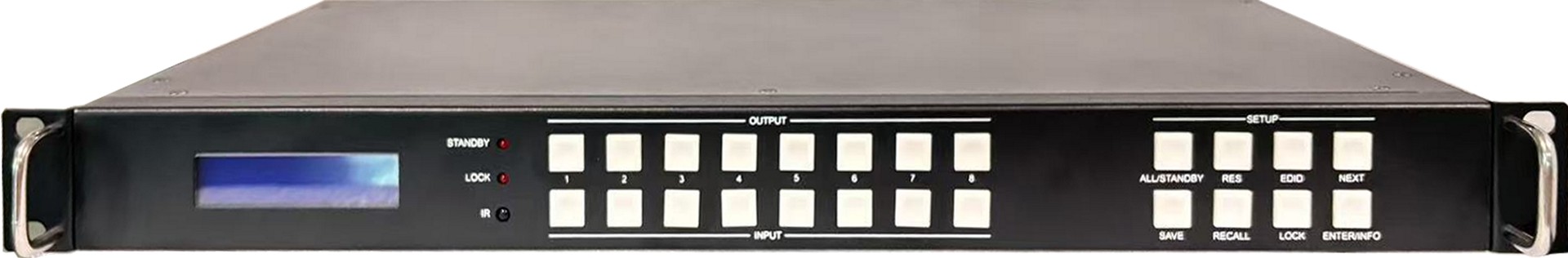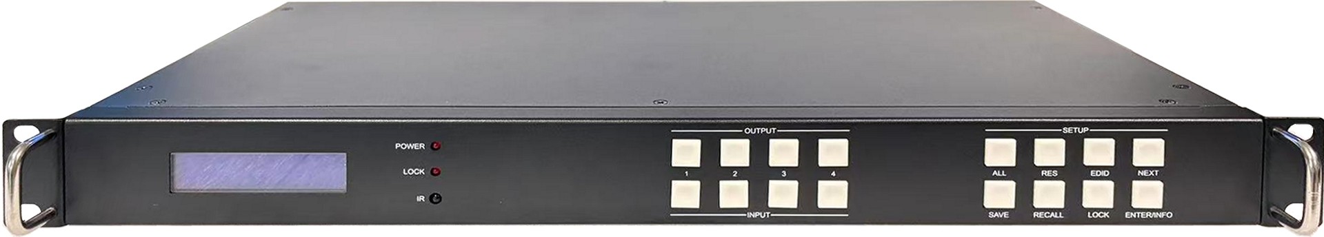 VM4K416:4x16 无缝切换矩阵视频处理器 1. 1U机箱,HDMI 2.0输入输出 2. 输入:4路HDMI 2.0,最高支持4K444@60Hz并向下兼容 3. 视频输出:16路HDMI2.0,最高支持4K444@60Hz并向下兼容 4. 音频剥离输出:3.5mm 耳机L/R + TOSLINK 5. 视频处理: A、4x16无缝切换矩阵,内置视频处理器功能 B、支持四画面漫游开窗 C、支持LCD液晶拼接,支持跨屏同步 D、支持LED小间距,任意分辨率输入,任意分辨率输出 6. 组合应用(液晶拼接,小间距,单屏显示): A、HDMI输出1~9:接3x3液晶拼接 B、低分辨率小间距:HDMI输出10,接一台发送器 C、高分辨率小间距:HDMI输出10~11等,接多路发送器 D、其他HDMI输出:接单屏显示
