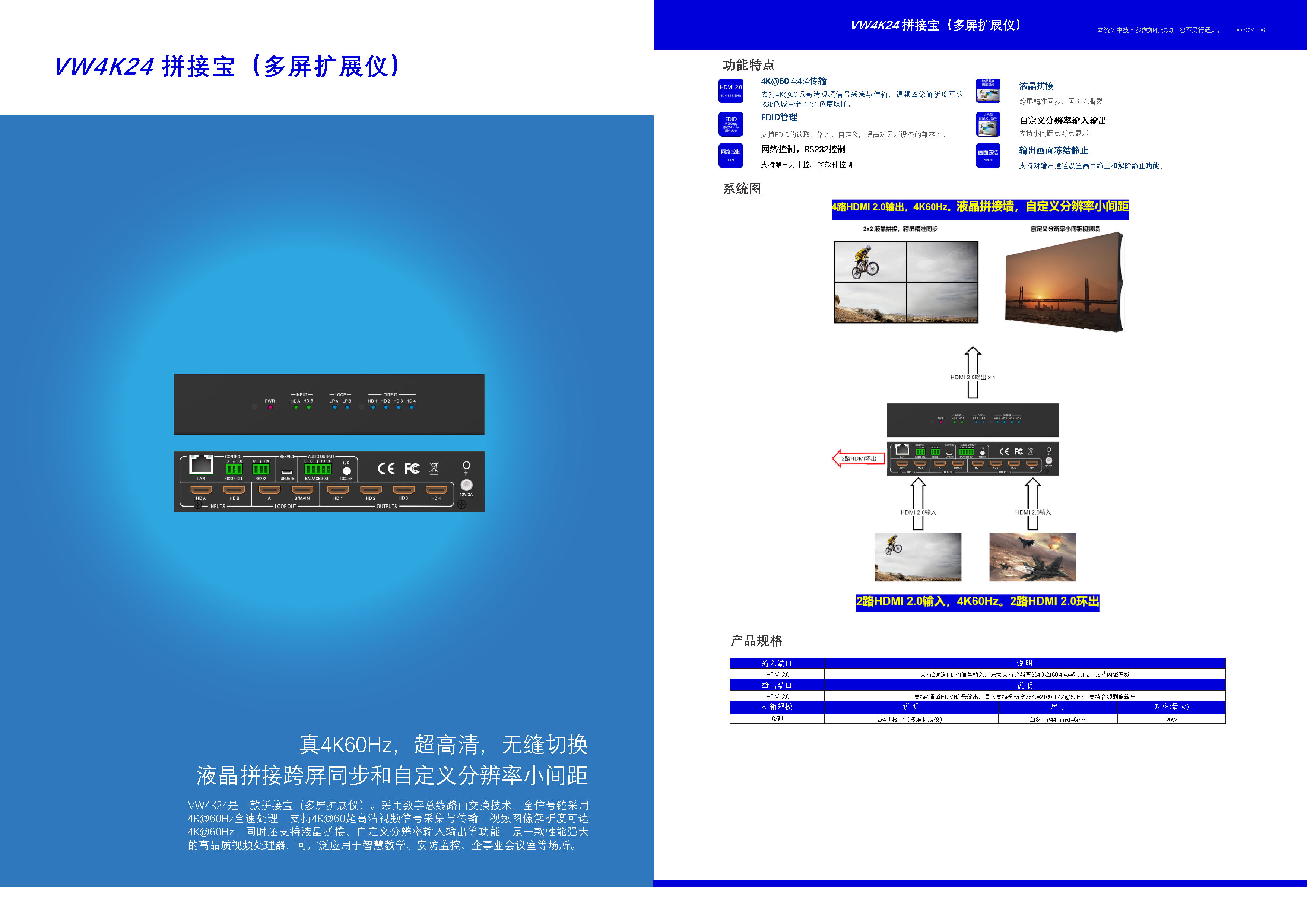 VW4K24:4K60Hz四路拼接器 1、输入:2路HDMI 2.0(二切一模式) 2、旁路输出:2路HDMI(多台级联) 3、拼接输出:4路HDMI 2.0