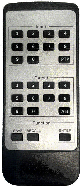 按键说明: 4. 输入通道按键:0~9 5. 输出通道按键:0~9 6. PTP快捷键:自动设置输出一为输入一,输出二为输入二,以此类推, 7. ALL快捷键:自动设置全部输出为指定一路输入。 8. SAVE按键:存储场景。 9. RECALL按键:调用场景。 10. ENTER按键:确认键