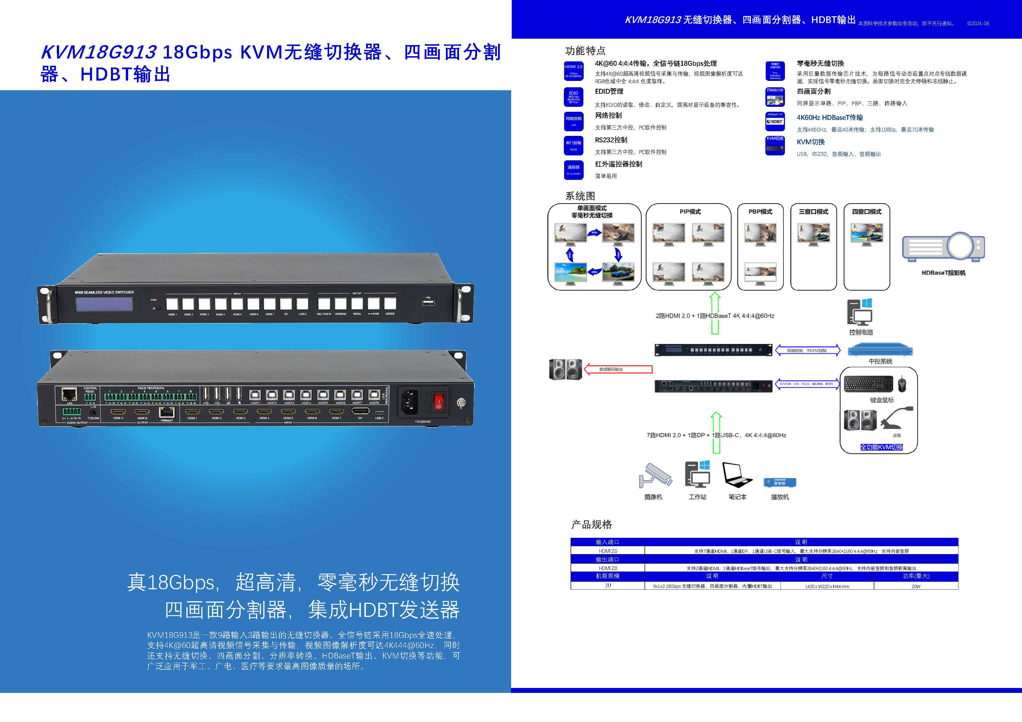 KVM18G913:9x1x3 4K60Hz无缝切换器 四画面分割+格式转换+HDbaseT发送 KVM管理+键鼠跨屏 用户手册:KVM18G913 KVM18G913亮点: 1、内置医疗级电源模块(台湾明纬) 2、视觉无损图像处理 3、真4K60Hz,全链路18Gbps 4、0ms无缝切换 1、9路输入:7xHDMI,DP,USB-C 2、3路输出:2xHDMI,HDbaseT(镜像) 3、内置HDbaseT TX,4K@40m。4K长传 4、8路USB2.0-B / RS232:接PC 5、两路USB-A键盘鼠标 支持跨屏 6、3路USB2.0-A 支持高速数据 7、控制:按键,RS232(凤凰插) 8、1U机箱 |