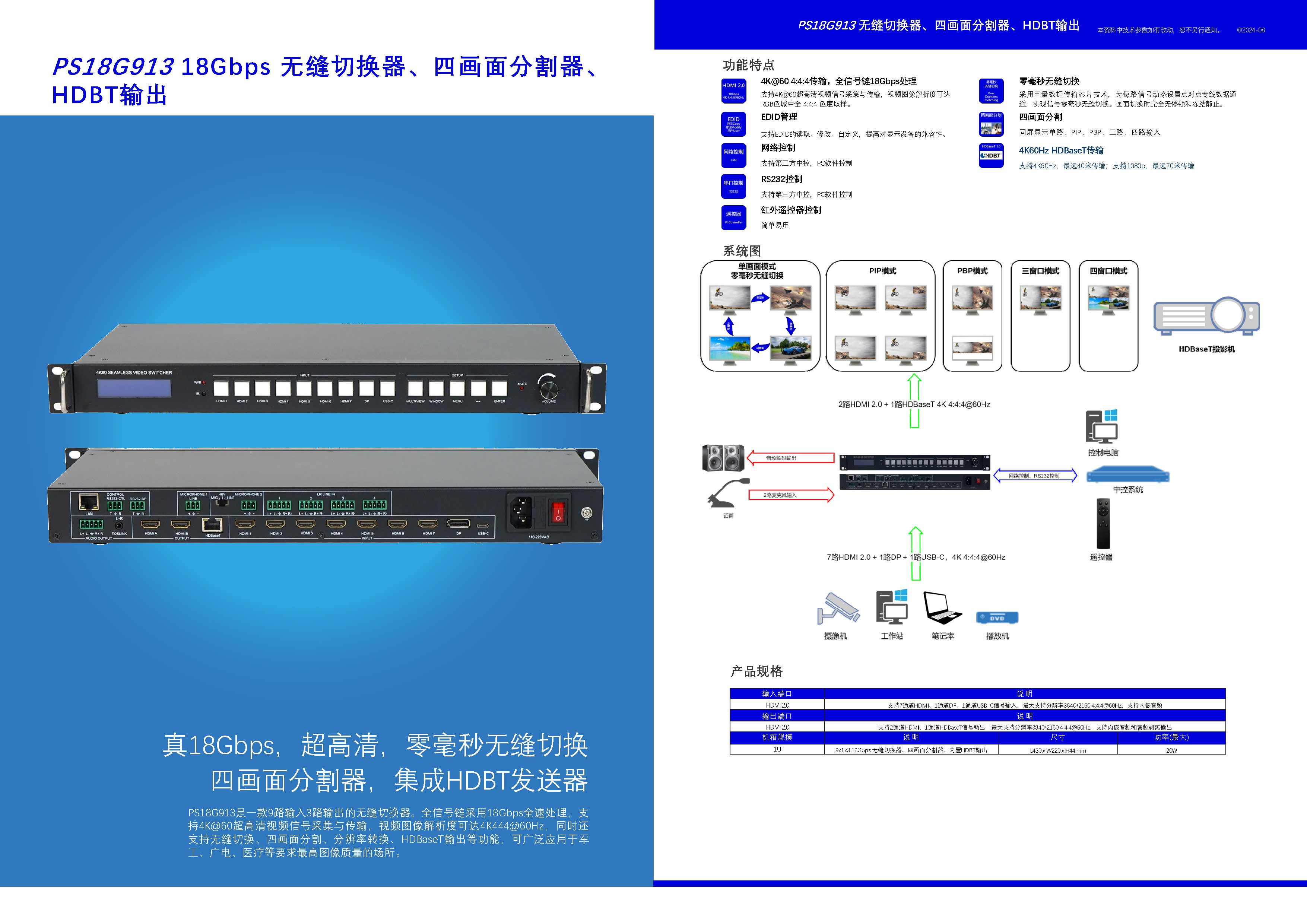 PS18G913:9x1x3 4K60Hz无缝切换器 四画面分割+格式转换+HDbaseT发送 演示切换器+音频麦克风处理 用户手册:PS18G913 PS18G913亮点: 1、内置医疗级电源模块(台湾明纬) 2、视觉无损图像处理 3、真4K60Hz,全链路18Gbps 4、0ms无缝切换 1、9路输入:7xHDMI,DP,USB-C 2、3路输出:2xHDMI,HDbaseT(镜像) 3、内置HDbaseT TX,4K@40m。4K长传 4、两路麦克风输入 支持48V幻象 5、四路模拟音频输入 (凤凰插) 6、控制:按键,RS232(凤凰插) 7、音量调整旋钮 8、1U机箱 |