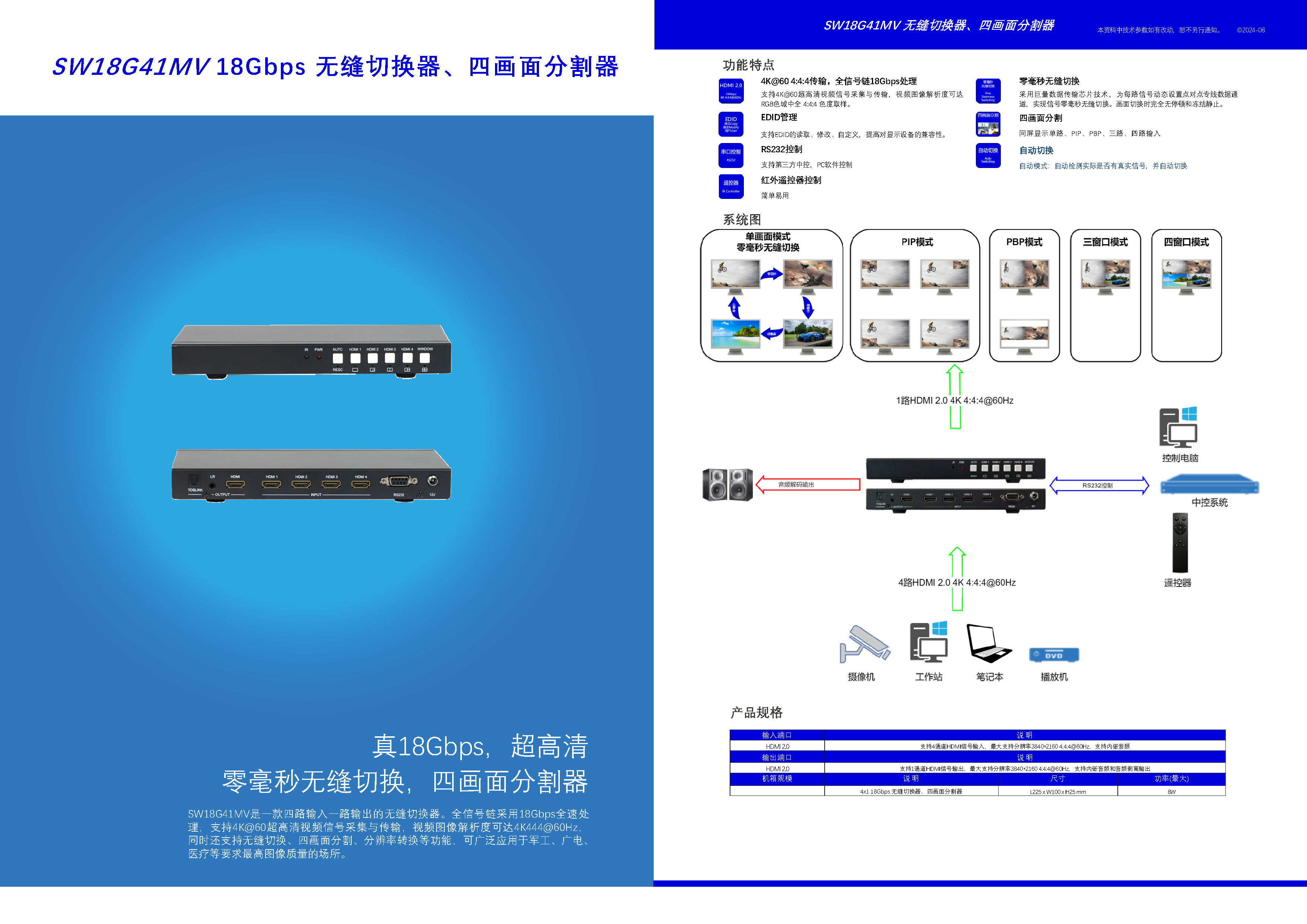 SW18G41MV:4x1 4K60Hz无缝切换器 四画面分割+格式转换 用户手册:SW18G41MV SW18G41MV亮点: 1、视觉无损图像处理 2、真4K60Hz,全链路18Gbps 3、0ms无缝切换 1、输入:4路HDMI 2、输出:1路HDMI 3、控制:按键,遥控器,RS232 4、演讲人模式:横向16:9摄像头,截取9:16
