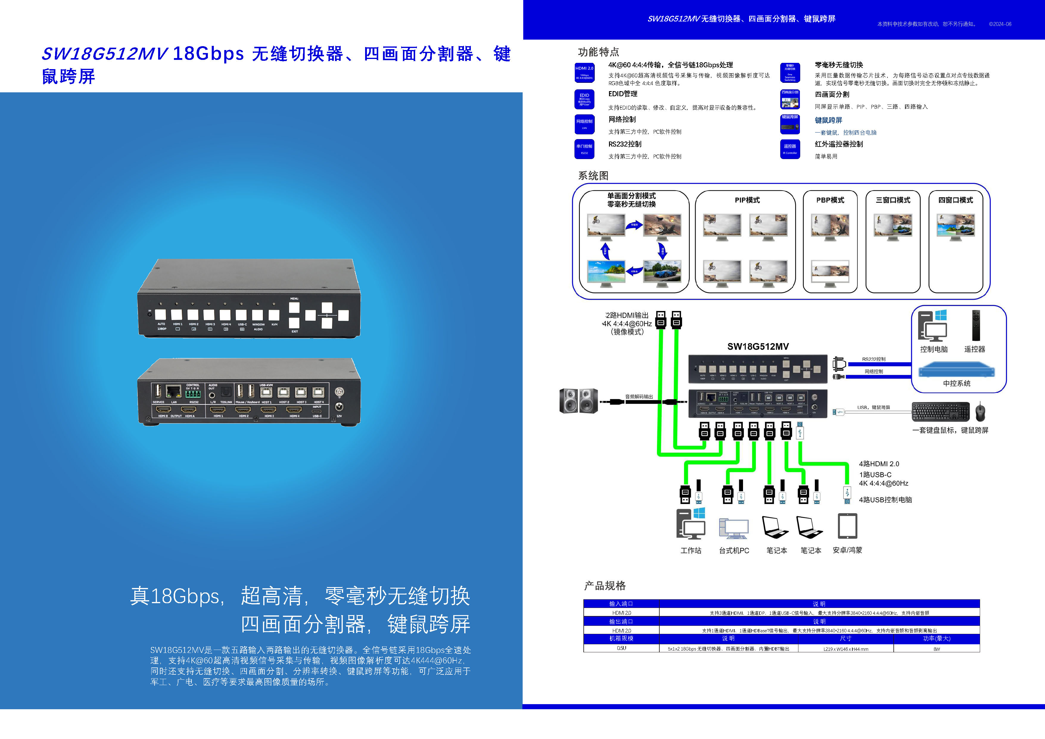 SW18G512MV:5x1x2 4K60Hz无缝切换器 四画面分割+格式转换+键鼠跨屏 用户手册:SW18G512MV SW18G512MV亮点: 1、视觉无损图像处理 2、真4K60Hz,全链路18Gbps 3、0ms无缝切换 1、5路输入:4xHDMI,USB-C 2、2路输出:2xHDMI(镜像模式) 3、KVM键鼠跨屏:4路USB-B 接PC,2路USB-A 接键鼠 4、控制:按键,遥控器,LAN网络透传,RS232(凤凰插) |