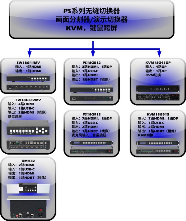 【无缝切换+画面分割+格式转换:PS18G913/512,KVM18G913/512/41DP,SW18G41MV/512MV】 【旧型号:PS913/ KVM913/ PS512/ SWB41MV/ KVM41DP/ SWB512MV】